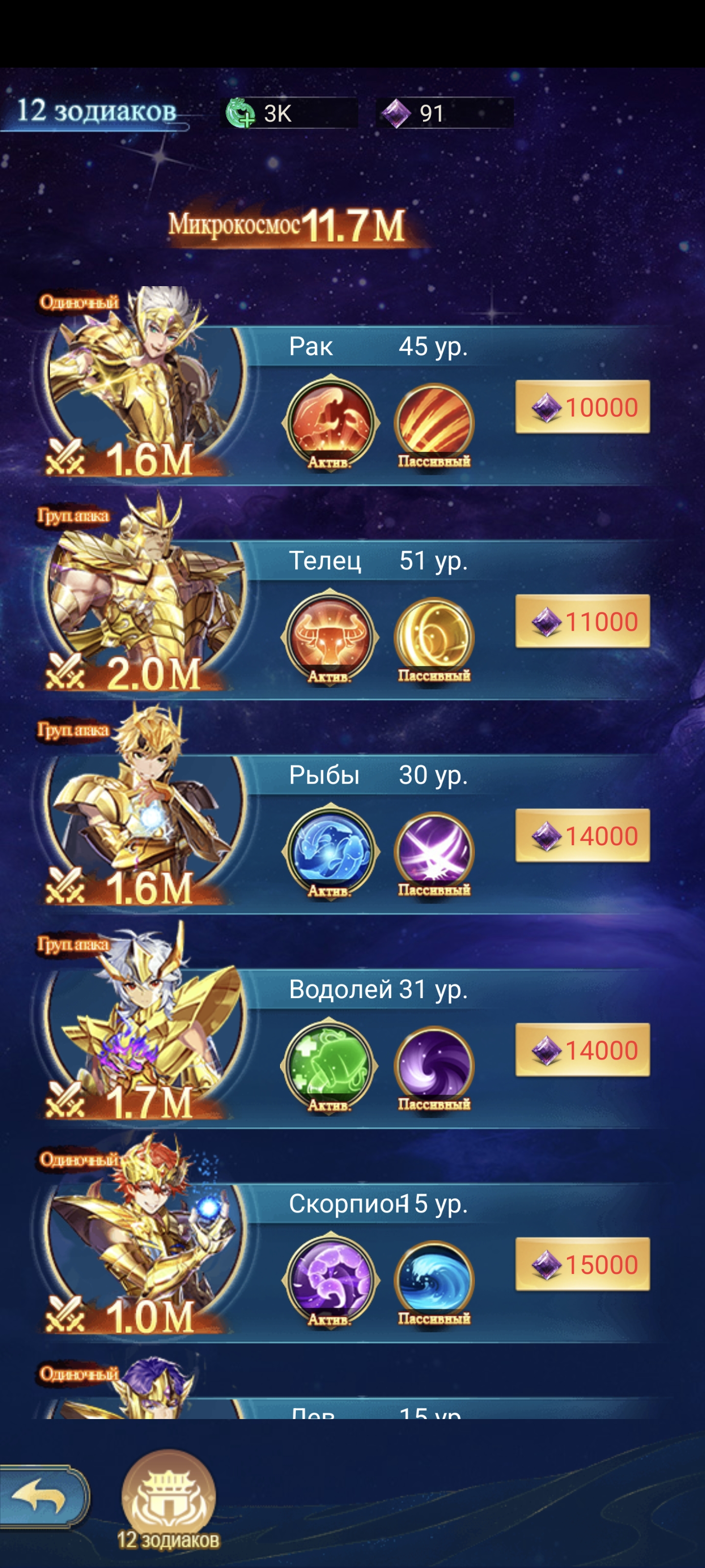 Так-же что бы повысить силу зодиаков которых выставляем, и их кол-во заходим в раздел (12 зодиаков)